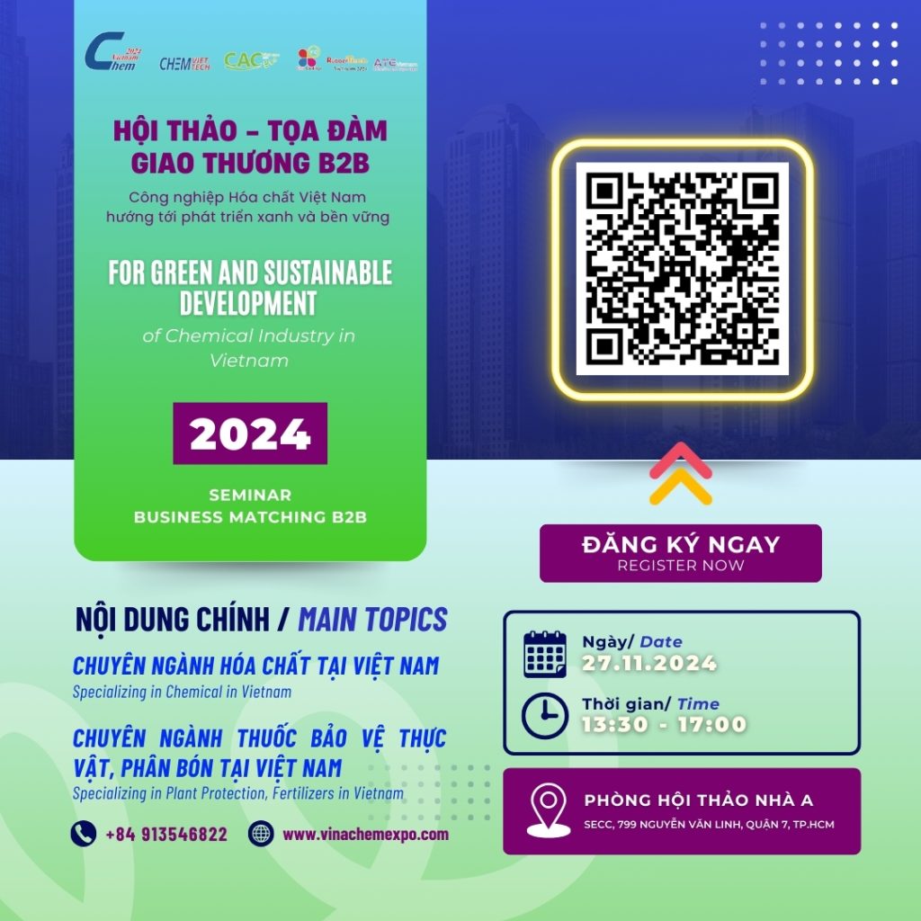 Thời gian: 13:30 – 17:00, Ngày: 27/11/2024 Địa điểm: Phòng Hội thảo Nhà A – SECC (Seminar Room – Hall A, SECC) Khám phá những xu hướng mới nhất và cơ hội đầu tư trong ngành Hóa chất và Nông nghiệp tại Việt Nam! Hội thảo chuyên ngành Hóa chất và Thuốc bảo vệ thực vật,